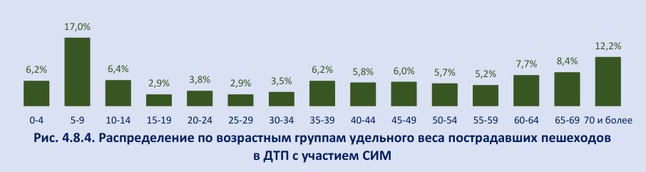 Распределение раненых пешеходов по возрасту существенно отличается от раненых, передвигавшихся на СИМ. Дети в возрасте до 10 лет составили почти четверть (23,2%) от общего числа раненых пешеходов. Еще более четверти (28,3%) пришлось на пешеходов в возрасте 60 лет и старше (рис. 4.8.4).