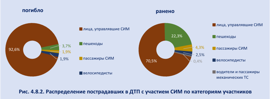 Из всех погибших в ДТП с участием СИМ 51 (94,4%) человек являлся лицом, передвигавшимся на СИМ, один из них являлся пассажиром СИМ. Двое погибших являлись пешеходами, на которых совершило наезд СИМ. Оба наезда на пешеходов совершены на тротуаре. В одном происшествии произошло столкновение лица, передвигавшегося на СИМ, и велосипеда при движении обоих по проезжей части (СИМ двигалось по краю полосы встречного направления, велосипед – попутного), в результате погиб велосипедист. В одном ДТП погибший передвигался на моноколесе по дороге с 6 полосами движения, на которой разрешено движение со скоростью до 80 км/ч. В 12 случаях лицо, передвигавшееся на СИМ, получило смертельные травмы в результате того, что не справилось с управлением и допустило опрокидывание. В 30 смертельных случаях произошел наезд ТС на СИМ. В 8 смертельных случаях наезд на СИМ произошел при передвижении СИМ по пешеходному переходу (лицо, передвигавшееся на СИМ, не спешилось), при этом в 4 случаях движение осуществлялось при запрещающем сигнале светофора.