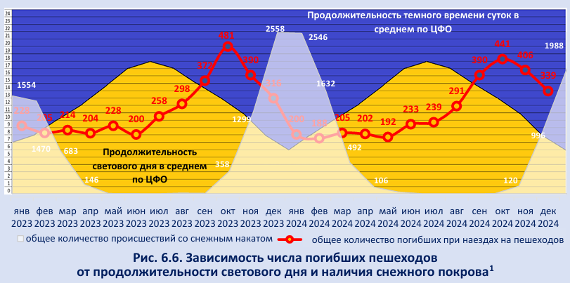 При наездах на пешеходов наблюдается зависимость общего количества погибших от продолжительности светового дня и наличия снежного покрова. Ввиду наличия у снежного покрова отражающего эффекта от света фар, а также высокой контрастности силуэта пешехода на его фоне в темное время суток обеспечивается лучшее визуальное выявление пешехода из общей дорожной обстановки. Как отмечено выше, первая половина года имеет более низкие показатели аварийности. Ежемесячное число погибших пешеходов с января по июль относительно стабильно и находится в диапазоне 200-239 погибших в месяц. Стремительный рост начинается с августа, достигая своего пика в октябре с числом погибших 441 человек, что двукратно превышает средние показатели первой половины года. Снижаться число погибших при наездах на пешеходов начинает с ноября с появлением снежного покрова, а также в соответствии с общей тенденцией аварийности, связанной со снижением транспортной активности (рис. 6.6).