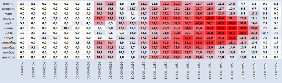 В зависимости от времени суток выделяется два промежутка времени, характеризующихся наибольшим удельным весом наездов на детей-пешеходов от всех происшествий данного вида: утреннее время (с 07:00 до 09:00), когда дети направляются в дошкольные и общеобразовательные организации, и дневное (с 12:00 до 18:00). В летний период наибольшая доля ДТП с участием детей-пешеходов приходится на время с 13:00 до 21:00 (табл. 7.2.1).
