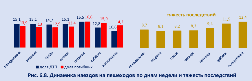 Наибольшее число наездов на пешеходов (76,5%) приходится на будние дни недели (рис. 6.8). При этом наибольшее число погибших приходится на пятницу (16,6%, или 553) и субботу (15,9%, или 530). Более высокие значения тяжести последствий рассматриваемого вида ДТП отмечаются в выходные дни (суббота – 11,5, воскресенье – 12,4).