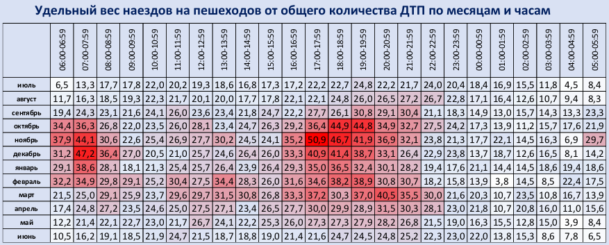 В темное время суток произошло более трети (37,2%, -5,6%, 12 798) наездов на пешеходов, доля числа погибших составила более двух третей (67%, 2 227, -2,5%) от всех погибших в таких ДТП. Показатель тяжести последствий ДТП в темное время суток (16,8) почти в 3,5 раза превышает аналогичный показатель для происшествий в светлое время суток (4,9).