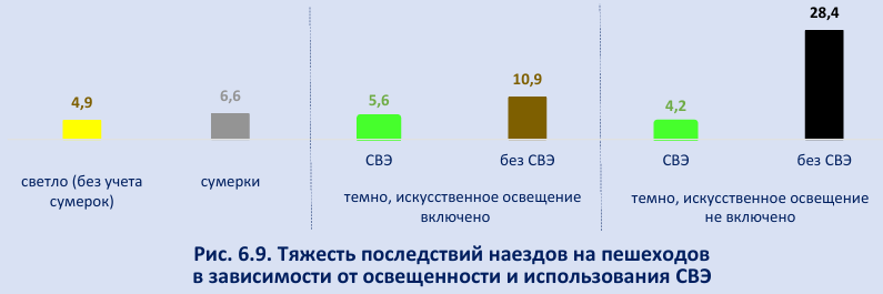 Говоря о темном времени суток, целесообразно также подчеркнуть эффективность использования пешеходами СВЭ. В темное время суток на участках автомобильных дорог с включенным искусственным освещением тяжесть последствий наездов на пешеходов, использующих СВЭ (5,6), практически в два раза ниже, чем аналогичный показатель для происшествий без наличия СВЭ (10,9). В случае отсутствия освещения тяжесть последствий наездов на пешеходов, использующих СВЭ (4,2), более чем в шесть раз ниже, чем при отсутствии СВЭ (28,4) (рис. 6.9).