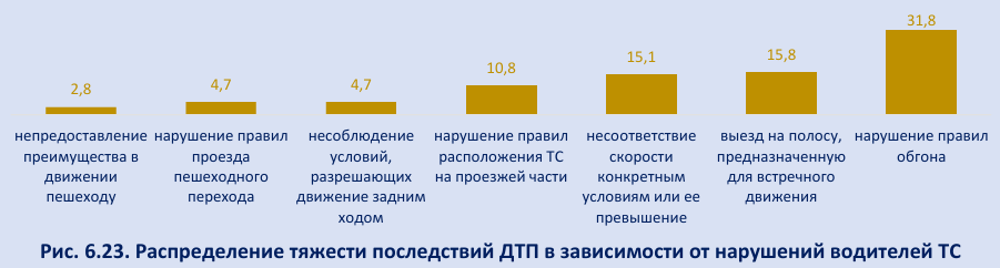 При этом, несмотря на внушительную долю ДТП по причине нарушения правил проезда пешеходных переходов и непредоставления преимущества в движении пешеходам, тяжесть последствий таких ДТП характеризуется одним из самых минимальных значений (4,7 и 2,8 соответственно). Указанное в первую очередь обусловлено особенностями организации дорожного движения на участках автомобильных дорог, где наиболее часто совершаются такие нарушения. Это, как правило, перекрестки и пешеходные переходы, на которых содержится большое количество технических средств организации дорожного движения, которые предупреждают участников об их вероятном контакте друг с другом и заставляют снизить скорость движения для большей внимательности и предусмотрительности. Наибольшее же значение тяжести последствий приходится на ДТП по причине выезда на полосу, предназначенную для встречного движения (15,8), а также нарушения правил обгона (31,8). Данная тенденция, вероятно, связана с тем, что, как правило, такие нарушения (маневры) выполняются при достаточно высокой скорости движения ТС. Это также отчасти подтверждается наличием большого удельного веса (32,9) погибших пешеходов из-за допущения водителем несоответствия скорости конкретным условиям движения (рис. 6.23).