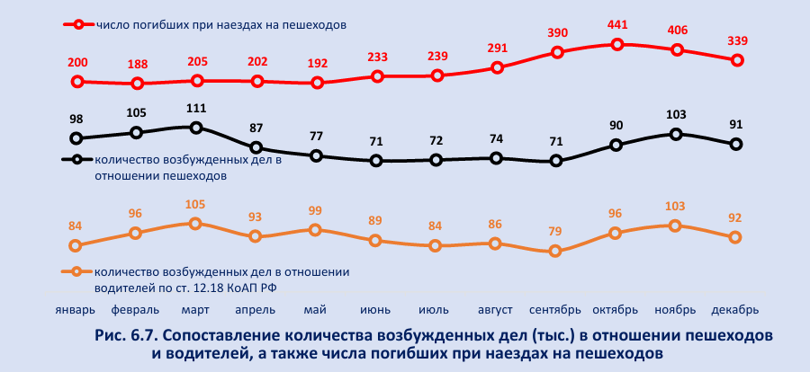 Данные о количестве возбужденных дел в отношении водителей ТС и пешеходов в конкретный месяц свидетельствуют о явной несвоевременности правоприменительной практики, которая не соответствует пику наездов на пешеходов (рис. 6.7).