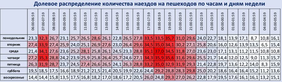 При этом в зависимости от дня недели временные интервалы рассматриваемых происшествий имеют некоторые особенности. В будние дни более высокий удельный вес наездов на пешеходов от общего количества происшествий наблюдается утром (с 07:00 до 09:00) и вечером (с 17:00 до 22:00), что может быть связано с транспортной активностью граждан в периоды передвижения на работу и домой. В выходные дни утром не наблюдается высоких долевых значений, а в вечернее время интервал наибольшего числа наездов смещается на более позднее время (табл. 6.3).