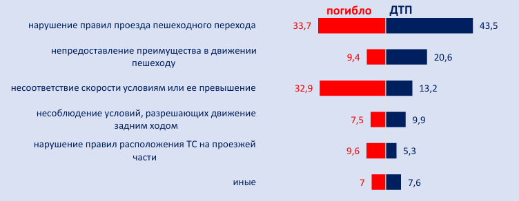 Наибольшее количество наездов на пешеходов по вине водителей произошло из-за нарушения правил проезда пешеходных переходов (43,5%, или 10 666), на эти происшествия приходится и наибольшее число погибших пешеходов по вине водителей (524, или 33,7%). Практически треть (513, или 32,9%) погибших по вине водителей пешеходов приходится также на наезды, произошедшие из-за несоответствия скорости конкретным условиям движения или превышения установленной скорости.