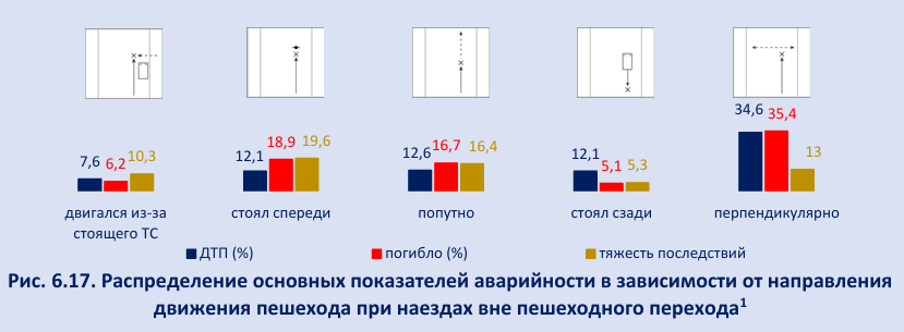 Из общего числа наездов на пешеходов вне пешеходных переходов в большинстве случаев (34,6%) пешеход двигался перпендикулярно проезжей части, на эти ДТП приходится и наибольшая доля погибших (35,4%). Высокая тяжесть последствий отмечается при наездах на пешеходов, когда пешеход двигался в попутном направлении (16,4) или стоял на проезжей части спереди по отношению к ТС (19,6) (рис. 6.17).