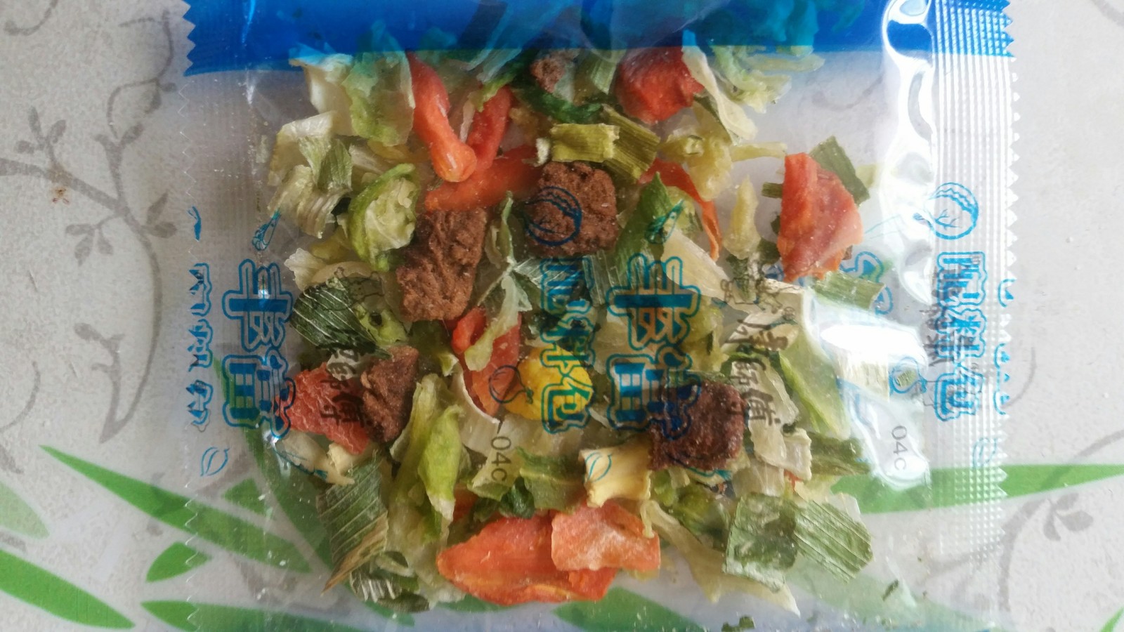 Овощи : морковка,зеленый лук, специи и кусочки мяса (даже не соя, вроде бы )