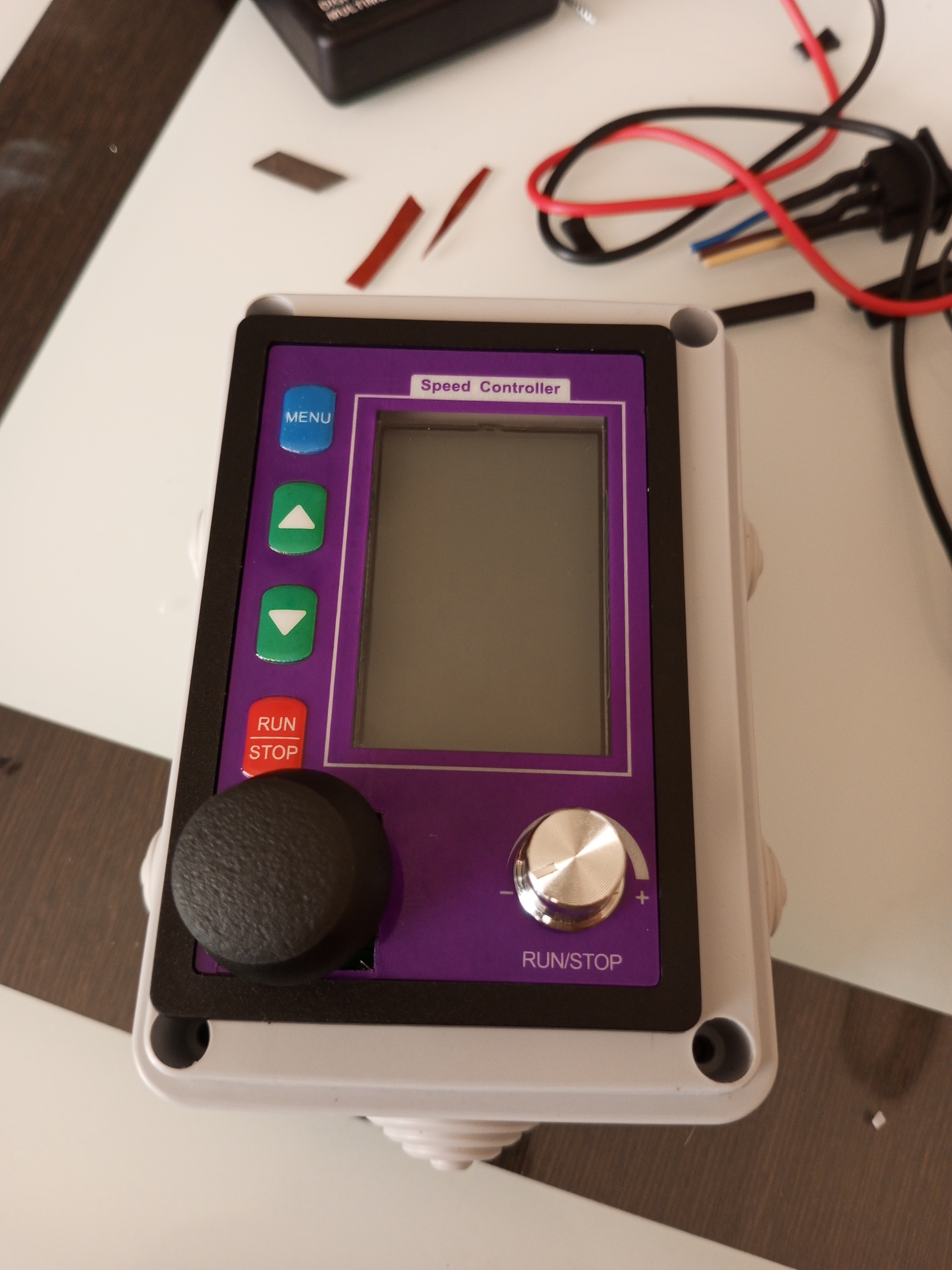 Снял голову с электромотора, вывел провода к шим регулятору, установил сервопривод для поворота, шим заказал с реверсом и экраном, очень удобно, показывает напряжение и нагрузку, перепаял кнопку реверса, еë вынес на торец пульта, а вместо этой кнопки внедрил грибок для поворота