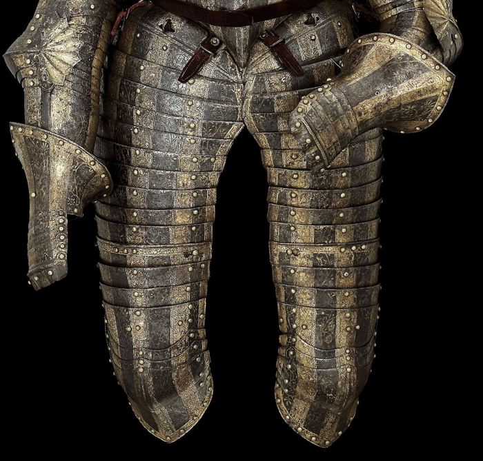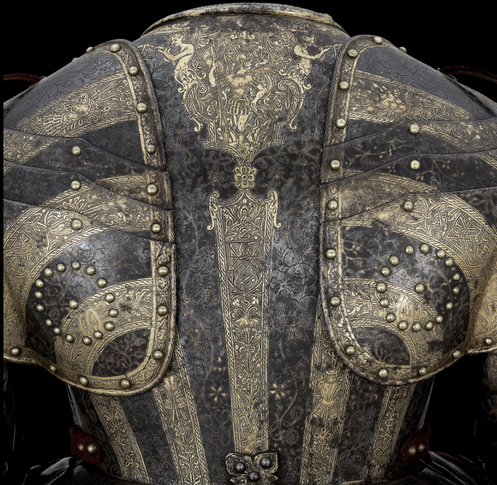 Среди декора доспеха присутствуют античные мотивы, изображение "трофеев", растительный орнамент, геральдические лилии французской короны (Fleur de lys).