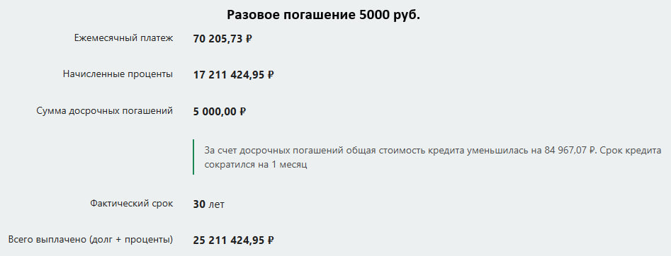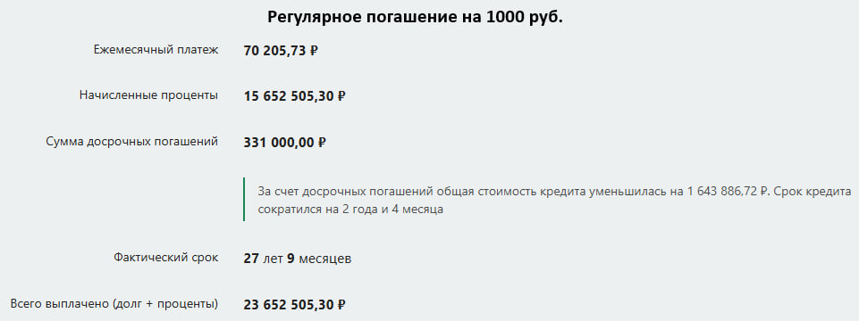 Да, 5000 может быть слишком большой суммой. Но регулярное погашение даже на 1000 рублей приносит свои плоды: общая стоимость кредита уменьшилась на 1 643 886,72 руб, а срок кредита сократился на 2 года и 4 месяца.