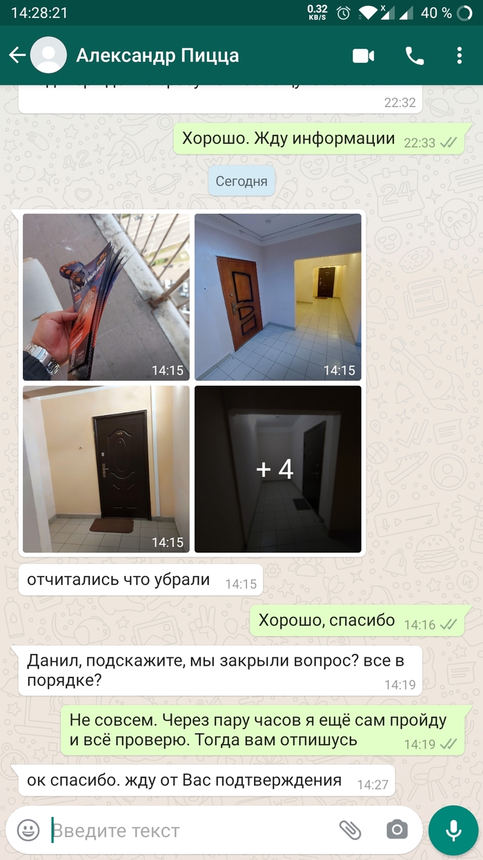 Пару дней назад опять уже другая пиццерия разместила рекламу на ручках квартир. Звонок сразу директору по отработанной схеме, и ЧЕРЕЗ ДЕНЬ только со мной связался некий менеджер, который уже 3 дня кормит завтраками по поводу уборки рекламы в подъезде. В этот раз я проиграл, но настойчивости мне не занимать.