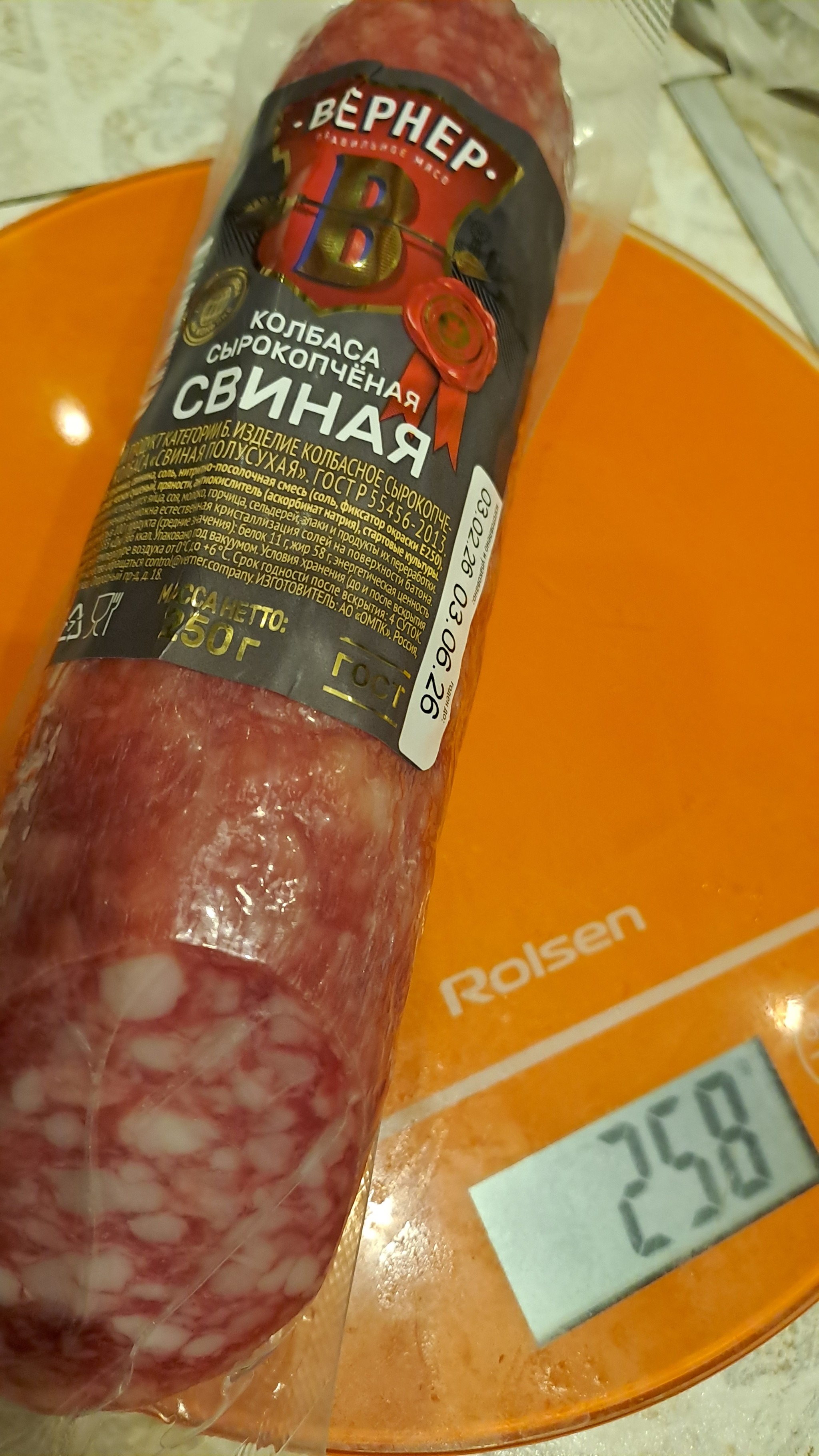 Добавляю фото колбасы нетто 250г, видно вес на упаковке. На моих весах брутто вышло 258 г, что вполне показывает, что весы достаточно точные