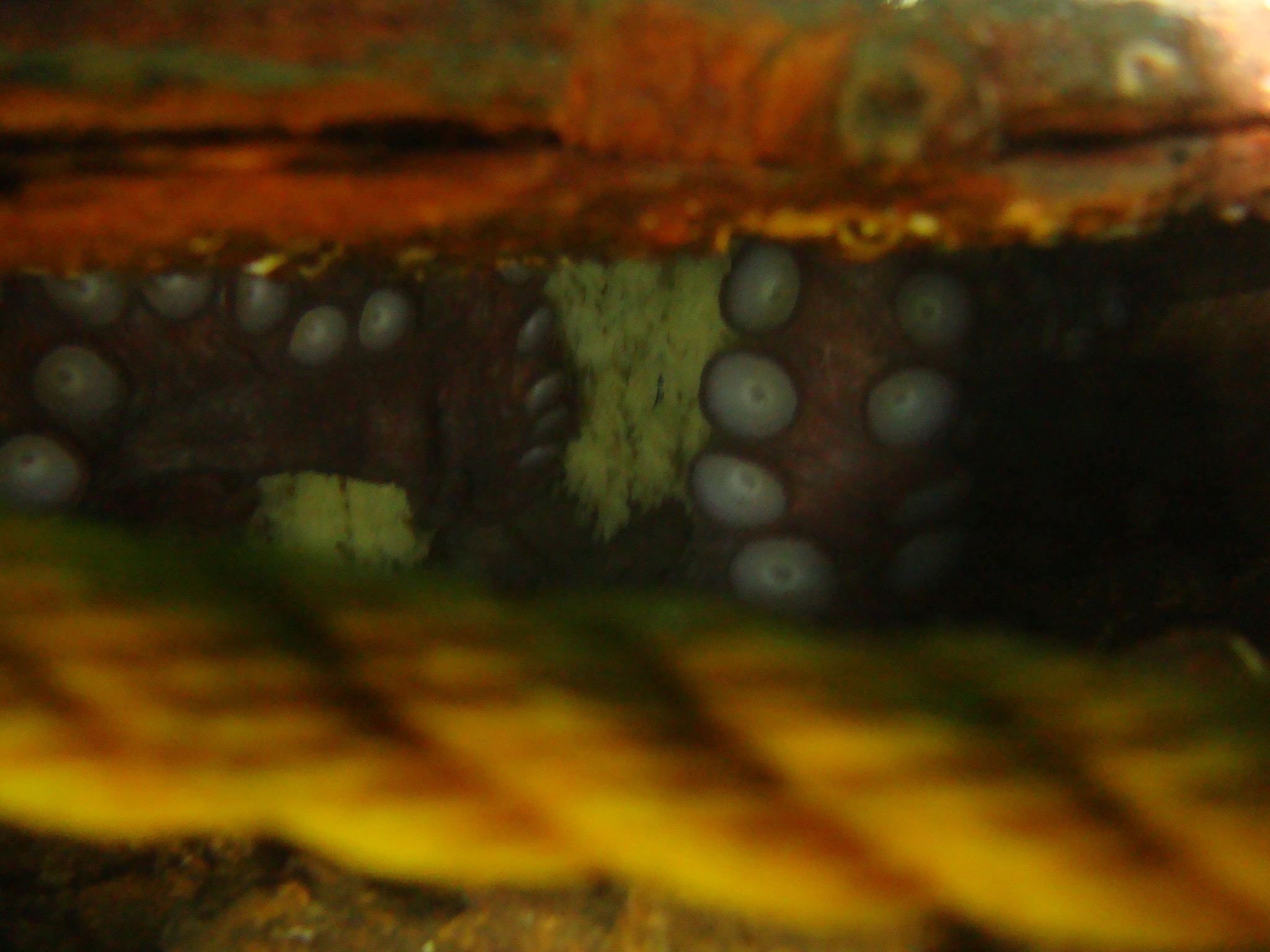 Примерно так выглядели осьминоги спрятавшиеся в какой нибудь щели под водой (мое фото, осьминог между металлическим щитом вверху и дном внизу, на переднем плане канат для сети буйков, направляющих дайверов по дну).