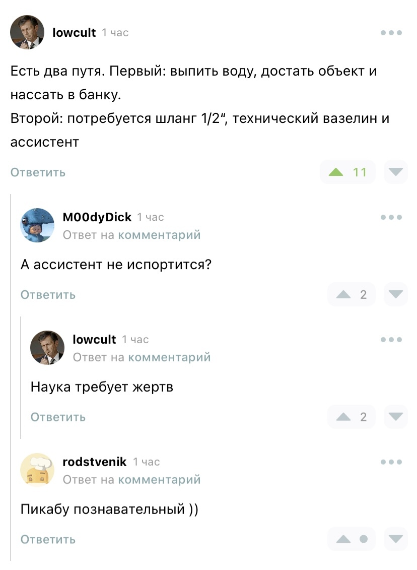 9 011100 2 дня назад Достать мандарин из стакана с водой или Пикабу познавательный #comment_371296906 Скриншот Юмор Комментарии на Пикабу 1 Ещё 0