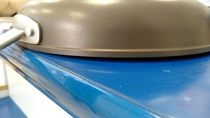 Ну, ёпта, как так? Ладно бы помяли немного, не удивлюсь, но ручка сковороды торчит из коробки сантиметров на 10. Распаковываю, вроде повреждений нет, ручка не погнута, покрытие сковороды не поцарапано, ладно, забираю.