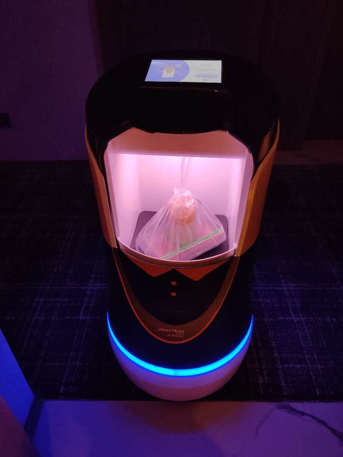 Заказал еду в отель через приложение. Курьер доставил еду до ресепшн. Далее персонал кладет заказ в робота и отправляет в номер.