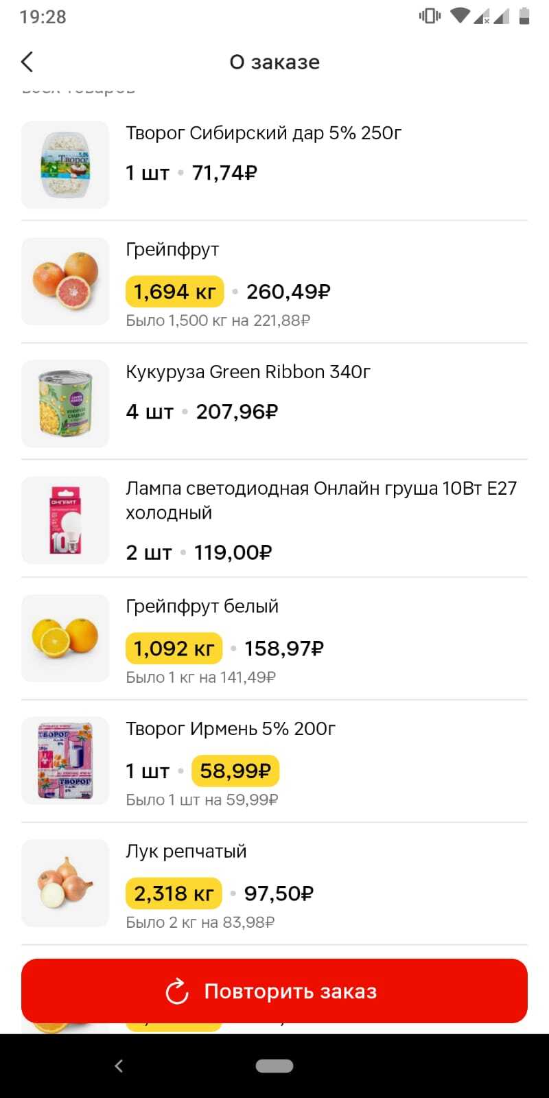 Грейпфрут было - 1.5 кг за 221.89 руб = 147.92 за кг , стало 1.694 кг за 260.49 руб = 153,77 руб за кг что на 4% дороже изначальной стоимости в заказе, при этом естественно никакого оповещения об изменении стоимости не предусмотренно и деньги автоматически списываются с карты после сборки. При этом учитывая характер возникновения проблемы, чем выше была изначально скидка в % и чем более значительно изменение веса тем больше будет и увеличение стоимости относительно изначальной, к примеру :