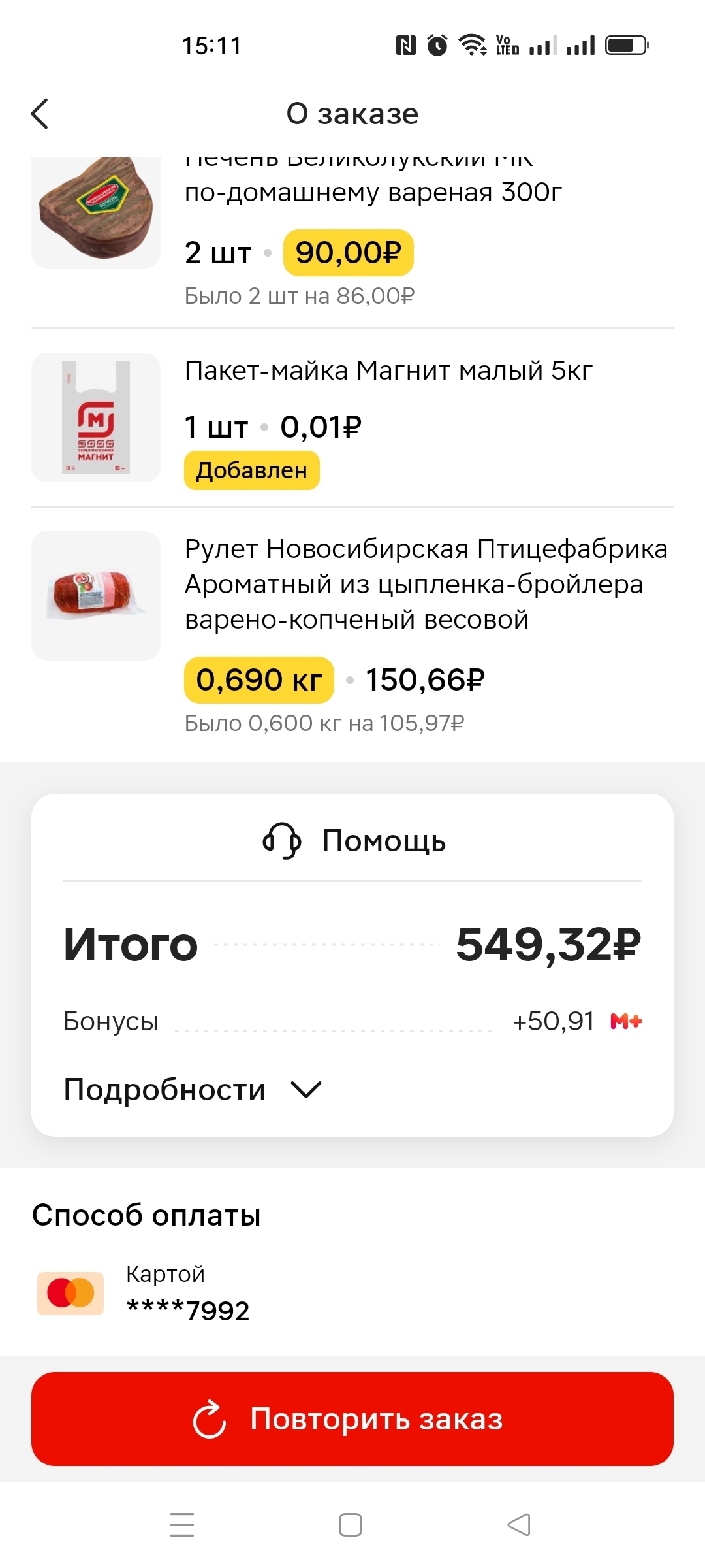 Тут не совсем корректный пример, так как часть суммы была оплачена баллами. По факту изначальная цена рулета была что-то около 495 руб за кг, со скидкой в 50% по промокоду 600 грамм я заказал за 150р из них 45 было плачено баллами итого 105 рублей как на скрине, но после перевеса до 690 грамм, к стоимости добавилось ещё 45 рублей , тоесть эти 90 грамм посчитаны по изначальной цене 495 руб за кг, без применения промокода.
