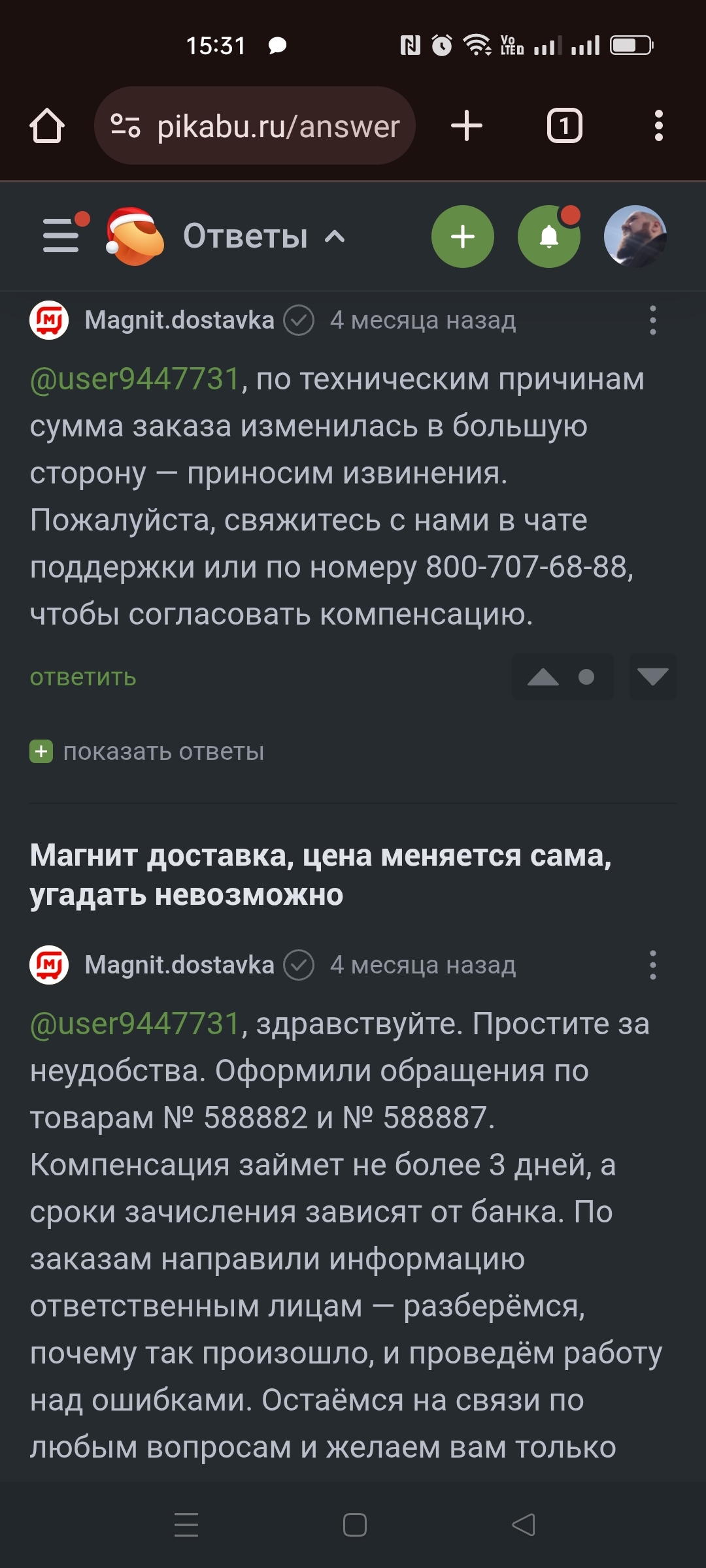 При этом Магнит признает что это их косяк и при обращении оформляет возврат, иногда возвращая разницу на карту, иногда (видимо когда сумма возврата маленькая) предлагая начислить бонусами или дать бесполезный промокод на 10% (это при том что в приложении постоянно действуют промокоды на 15-20%).