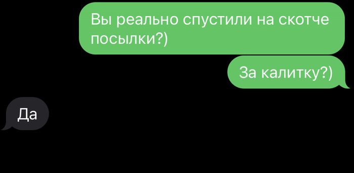 В общем я очень удивлен, человек мог просто уехать, но вместо этого он взял скотч, перемотал посылки и спустил их аккуратно и даже при том что я не ответил доставил посылку. Еще раз хочу уже здесь поблагодарить доставщика) спасибо вам большое, вы сделали мой день)