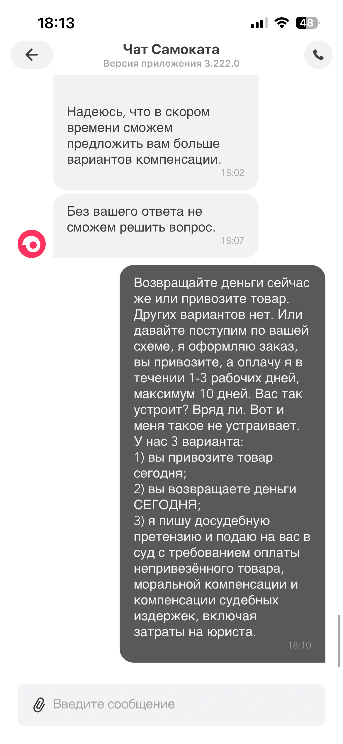 2) Почему я должен платить здесь и сейчас, а они до 10 дней? Возврат? Ну так сделайте сейчас через отмену покупки. Тут не работает правило 14 дней по ЗОЗПП. Тут не мой отказ от покупки, а не выполнение условий публичной оферты. Это они отказались выполнять условия договора. Тогда давайте обсуждать пени за пользование моими деньгами. Но они не будут же этого делать почему-то.