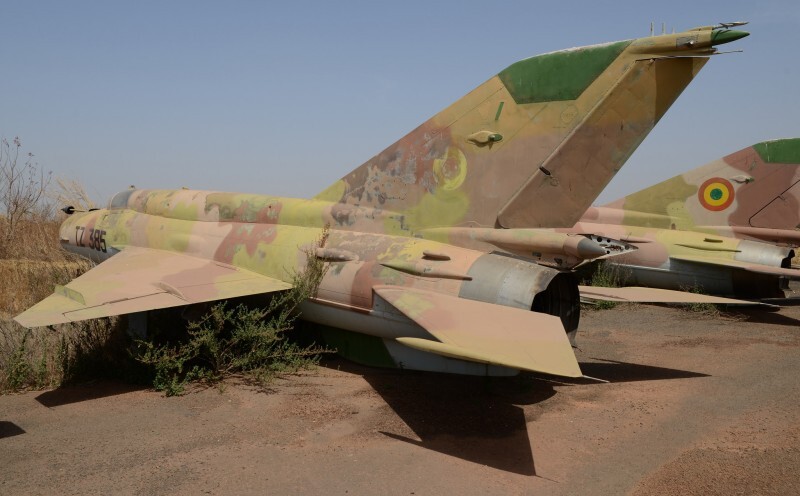 Истребители МиГ-21бис и МиГ-21УМ, ранее принадлежавшие ВВС Мали, на задворках аэродрома Бамако. 2015 год.