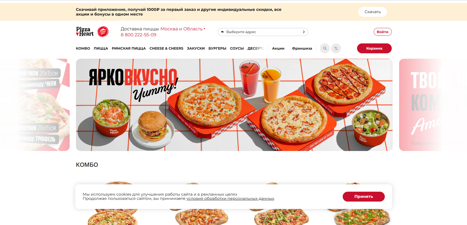 Комбо-предложения позволяют выбрать наборы по выгодной цене — два вида пиццы, комбо с закусками и напитками.