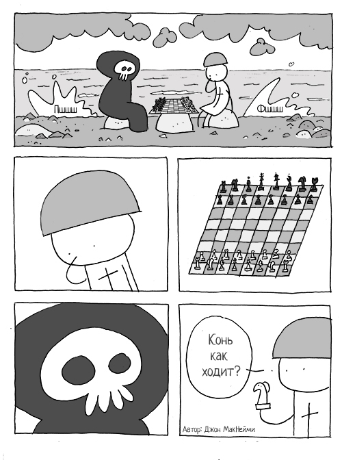 Как ни странно, Смерть не особенно разозлился. Злость – это эмоция, но для эмоций требуются железы, а Смерти железы ни к чему, поэтому ему нужно было очень уж завестись, чтобы разозлиться. Но легкое раздражение он все же испытал. Он снова вздохнул. Люди не раз пытались проделать подобные штучки. С другой стороны, за этим довольно интересно наблюдать, и, по крайней мере, данный фокус был чуть более оригинальным, чем обычная символическая игра в шахматы, которой Смерть всегда побаивался, поскольку никак не мог запомнить, как ходит конь.