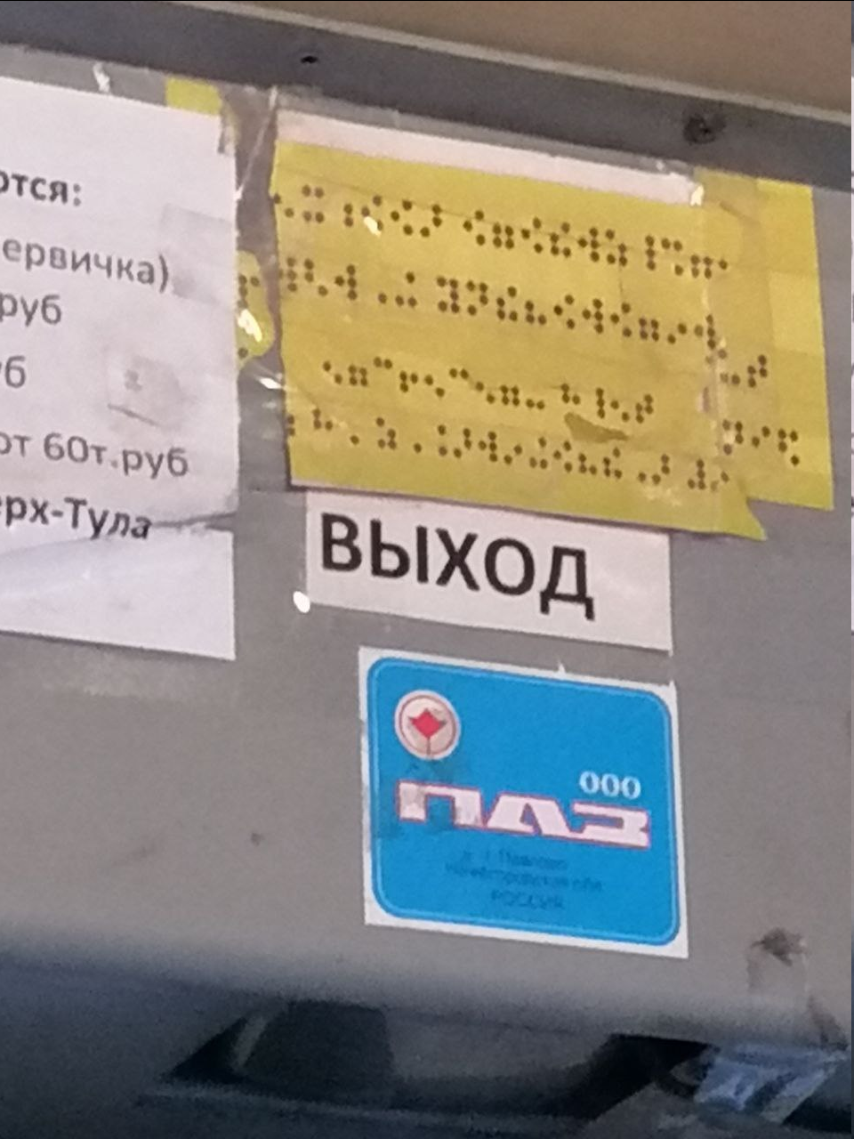 В одном из автобусов нашего городка. Попытка изобразить табличку со шрифтом Брайля. Напечатано на принтере, на бумажке, сверху заклеено пленкой, чтоб не пачкалось. Смысл инсталляции не ясен. Но попытка изобразить заботу о невидящих была? Была! Что надо сказать? Спасибо!