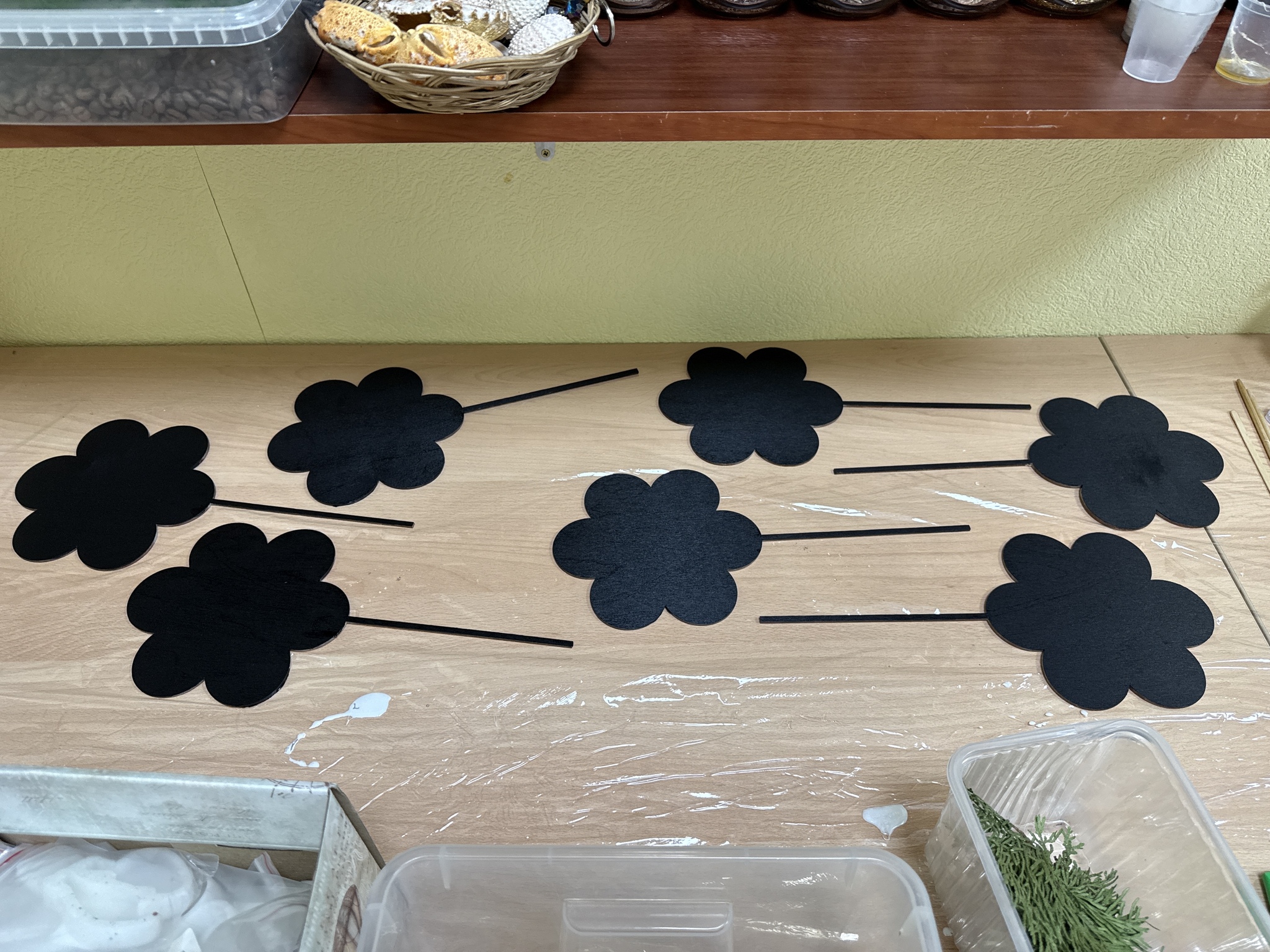 Уже фиг знает сколько лет пылились в мастерской фанерные цветочки на палочках. Понятия не имею, откуда они взялись и для чего изначально планировались- но выкинуть вроде было жалко. А тут прям звезды сошлись- и испортить не страшно, и хоть какая то польза от них будет.