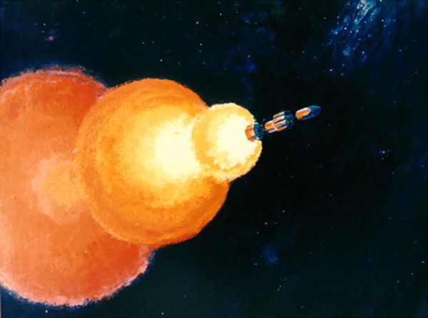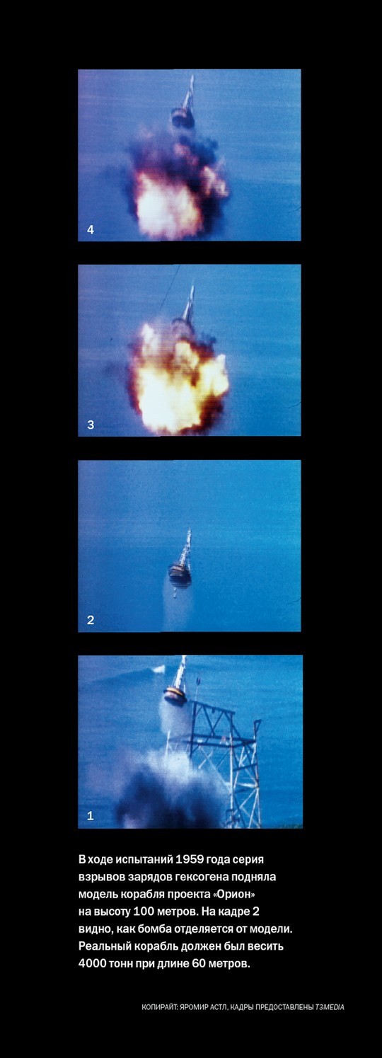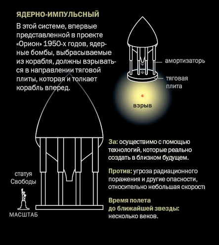 «Это было бы невероятно опасно, — признает Дайсон, собиравшийся лично участвовать в экспедиции на Сатурн. — Но мы были готовы рисковать. Такое тогда было у всех настроение: приключение без риска не имело смысла». Через несколько лет после закрытия проекта «Орион» Дайсон объяснял в журнале Physics Today, каким образом космический корабль, использующий энергию ядерных взрывов, может добраться и до звезд.