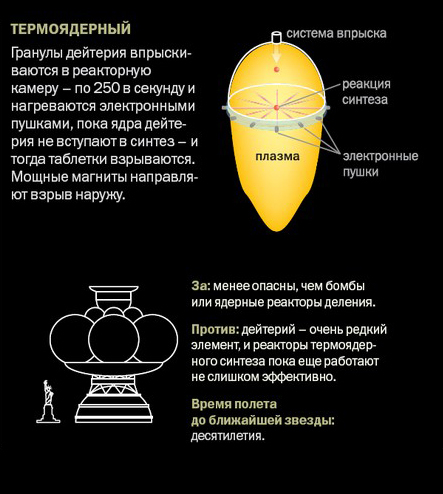 Циолас считает, что можно было бы разработать двигатель для межзвездного корабля, который будет использовать ядерный синтез — источник энергии звезд и водородных бомб. Когда ядра маленьких атомов, таких, как водород, сплавляются, они выделяют огромное количество энергии, намного больше, чем производится при расщеплении ядра крупных атомов, таких, как уран — источника энергии атомных электростанций и старого двигателя NERVA. Физики пока не нашли способ создать реактор термоядерного синтеза, который вырабатывал бы больше, чем потреблял. «Я верю в нашу изобретательность», — говорит Циолас. И напоминает: всего семь десятилетий прошло с момента открытия элементарных частиц до создания двигателя NERVA. К 2100 году, полагает ученый, мы сможем создать термоядерный двигатель, способный разогнать корабль до скорости, составляющей 15 или 20 процентов от скорости света.