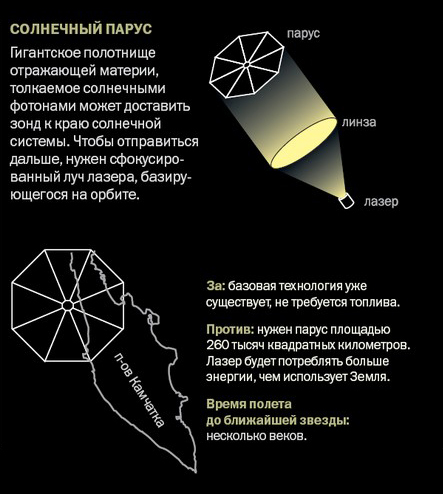 Один из способов привести в движение межзвездный корабль, по словам Леса Джонсона из НАСА, — парус, толкаемый солнечным светом или лазерным лучом. Парус должен быть блестящим, как зеркало, толщиной с волос, а площадью — с полуостров Камчатка.