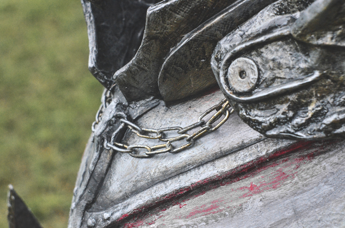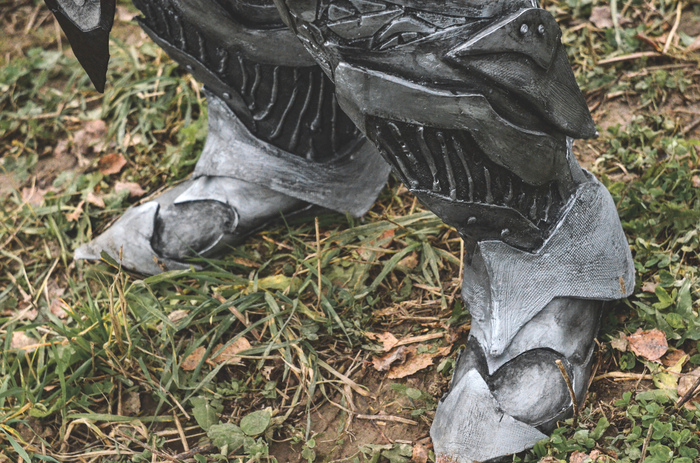 Броня для ляшках сползла, и стали видны нитки белые яркие на чёрных штанах их закрасить пришлось, моя ошибочка