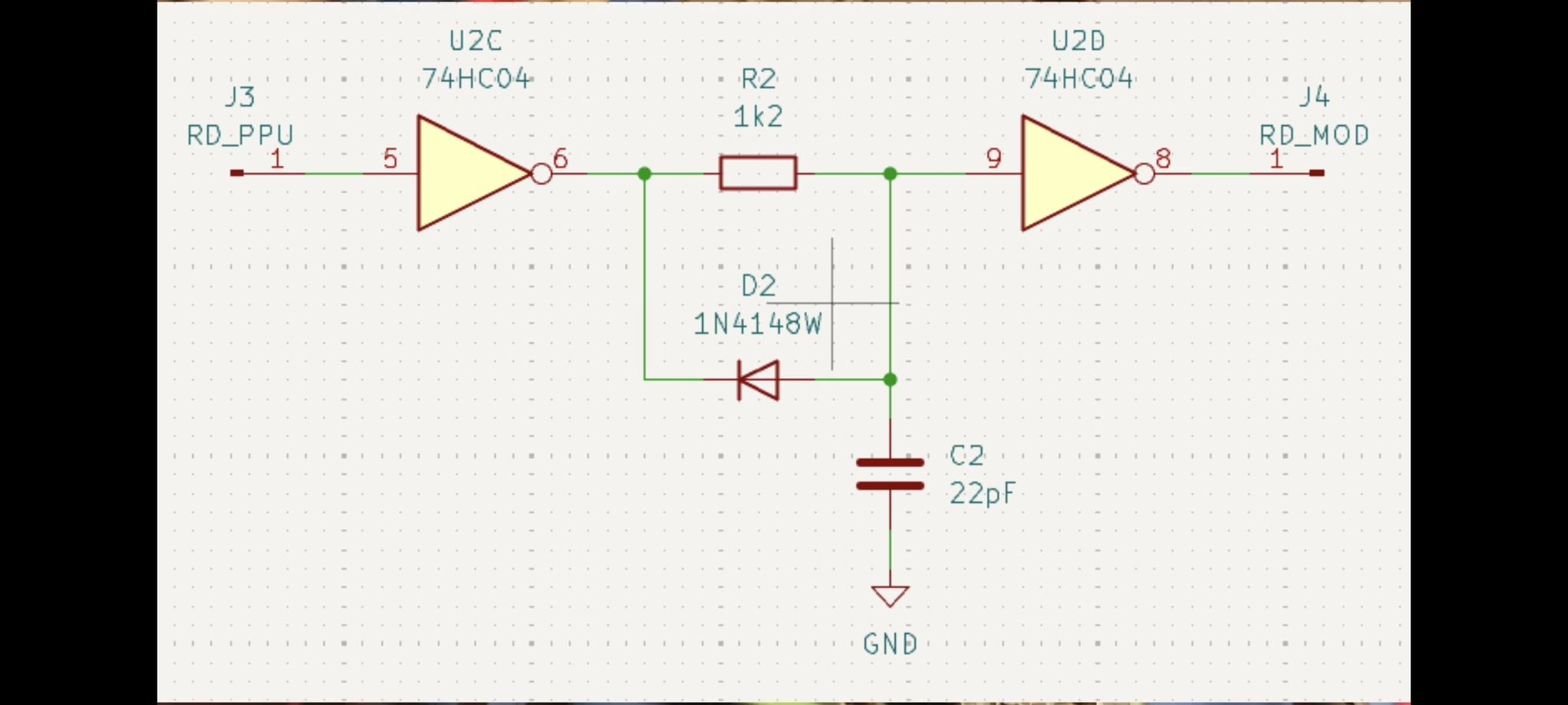 И видим серьёзные проблемы у сигнала M2 во время перехода к чтению: фронт M2 почти опережает фронт R/W. Естественно, это создаёт ошибки на шине процессора. Решение - слегка отодвинуть фронт M2 вправо. Именно для этого сделана RCD цепочка, бездумно копируемая со схемы Famicom и в наши дни: