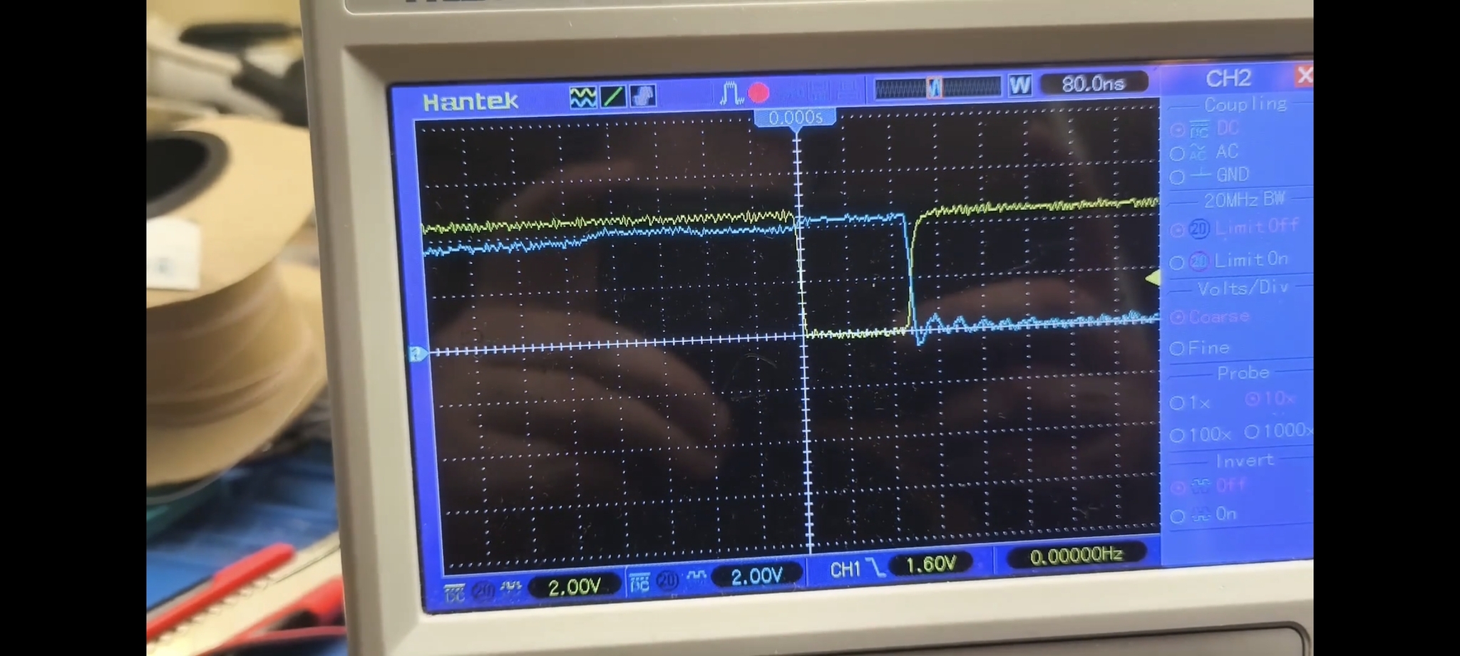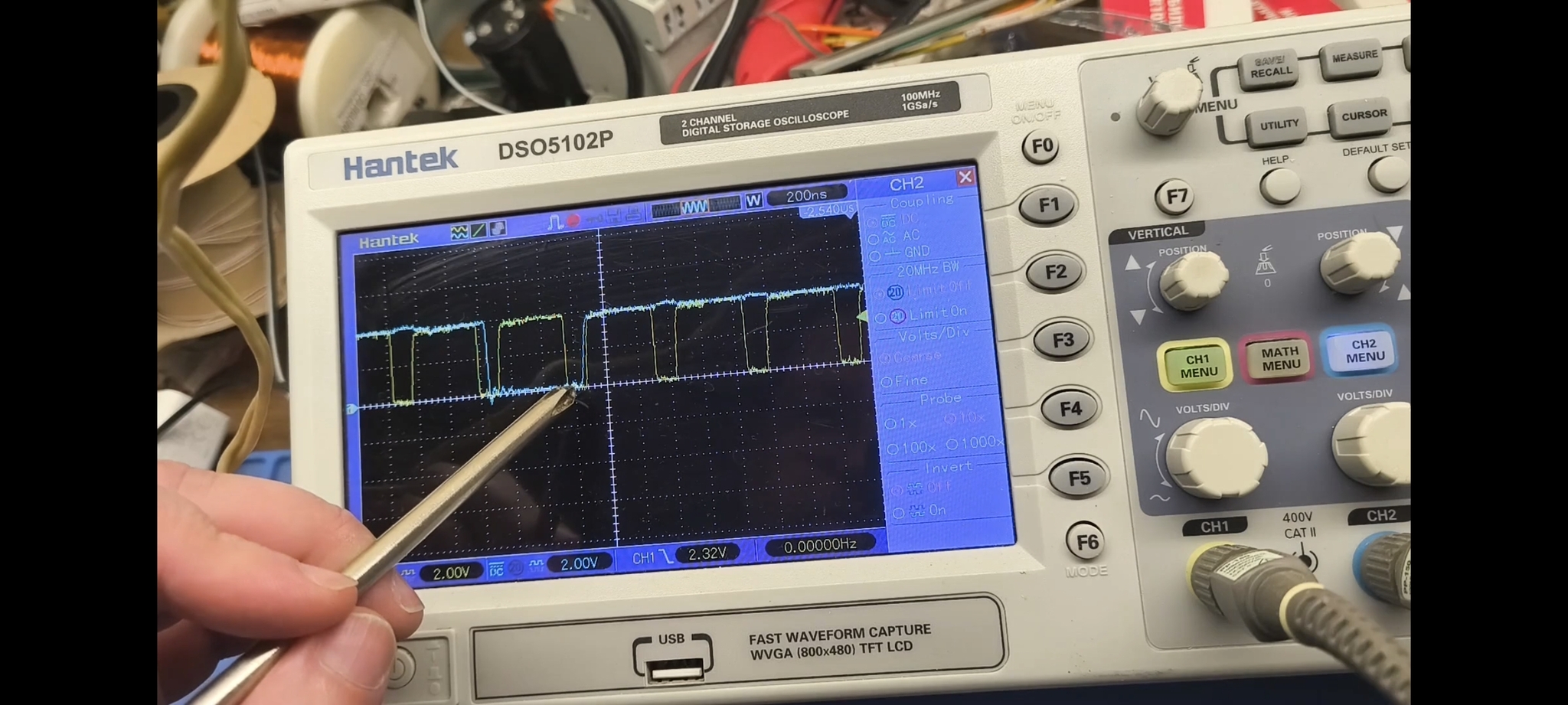 Сзади навесом напаяны несколько элементов. Для чего же их поставили? А вот для чего. Взглянем на осциллограмму сигнала процессора М2 (жёлтый) относительно сигнала R/W (синий):