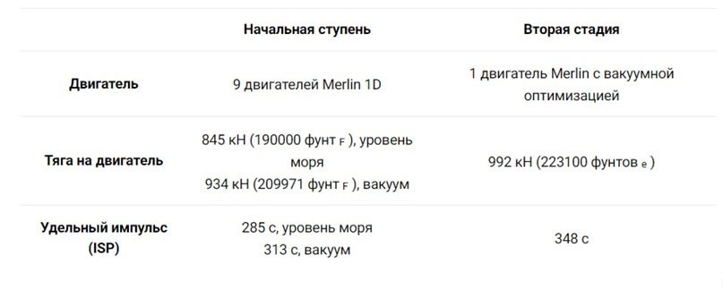 Двигатель Merlin работает на ракетном керосине (RP-1) и жидком кислороде (LOx) и использует цикл газогенератора. Falcon 9 использует гелий для наддува топливных баков, поскольку RP-1 и LOx потребляются двигателями во время всплытия.