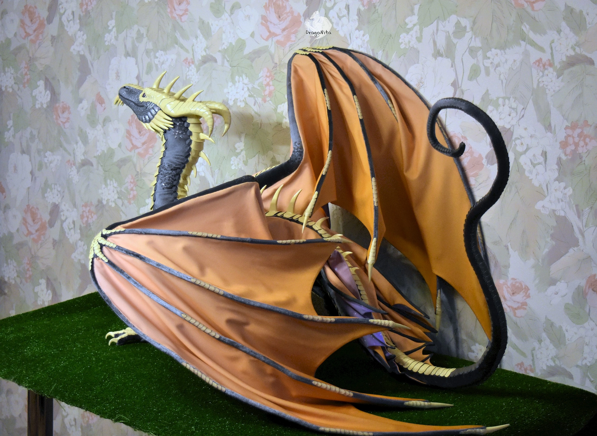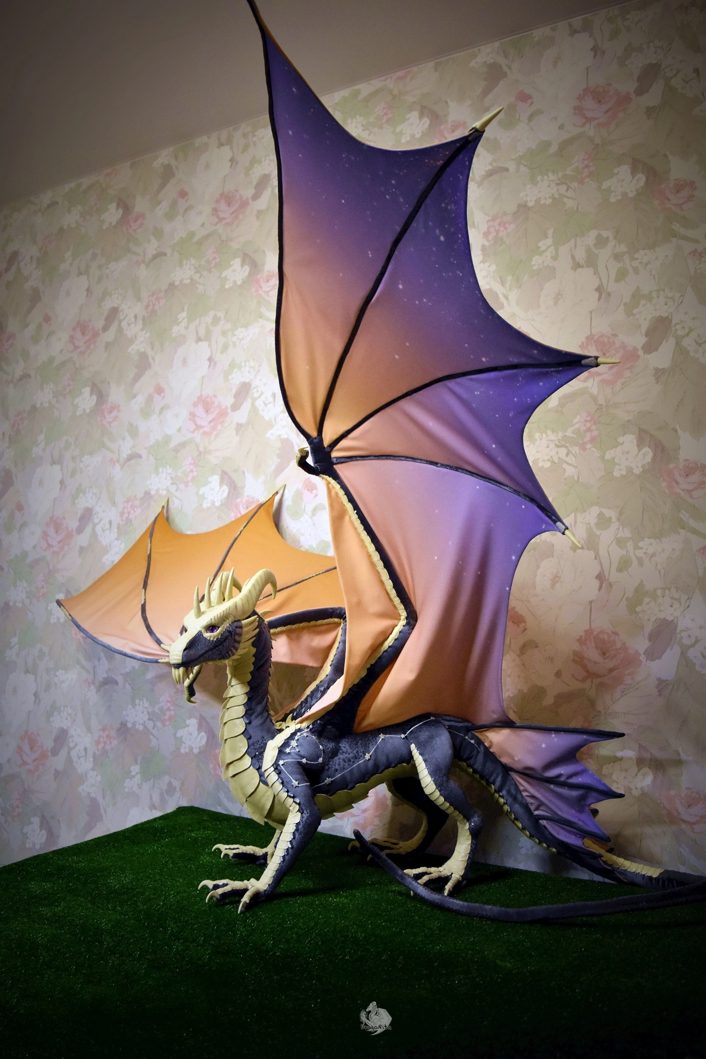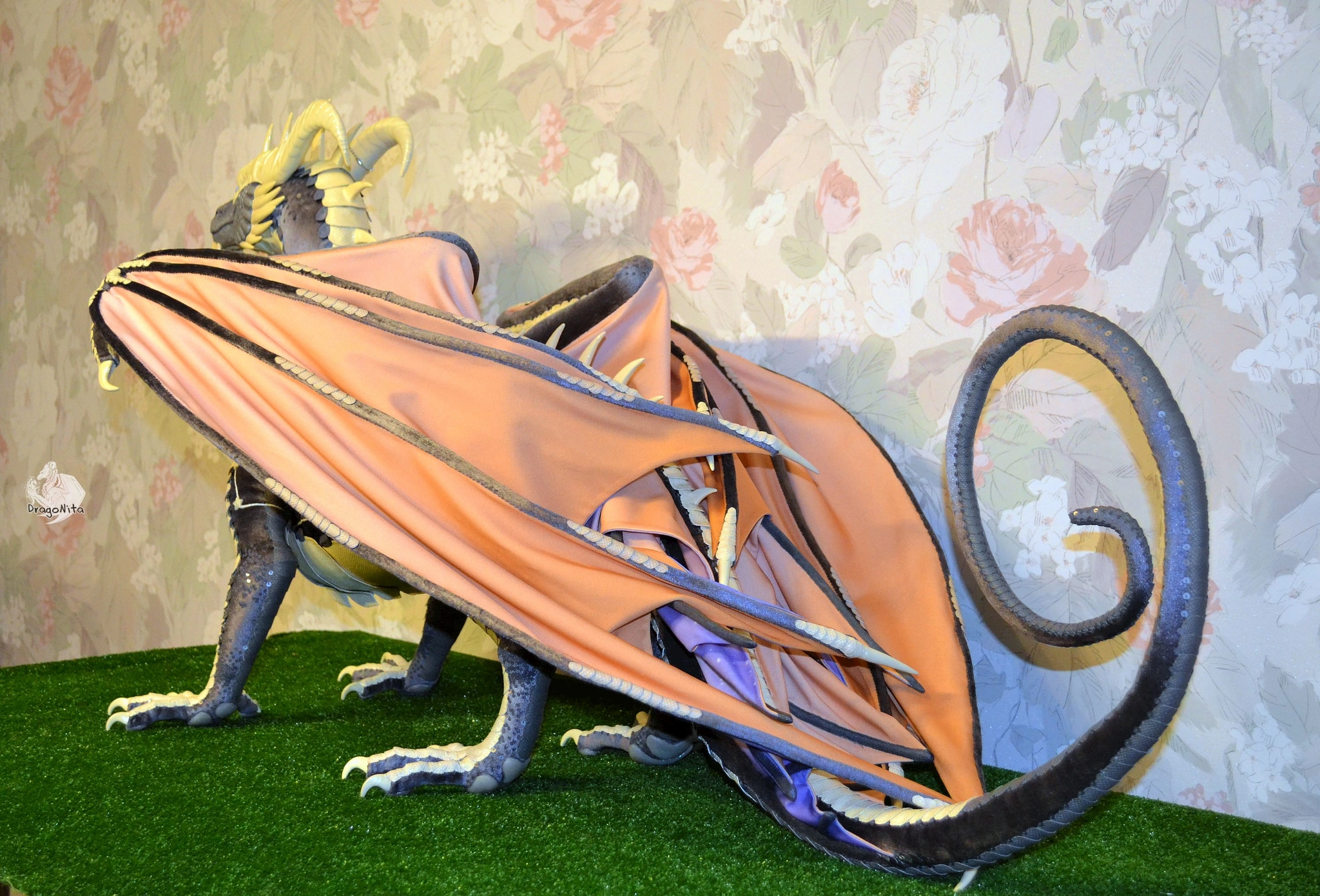 Длина тела дракона от носа до хвоста 224 см, высота в холке 29 см, высота по рога 60 см, размах крыльев 320 см.