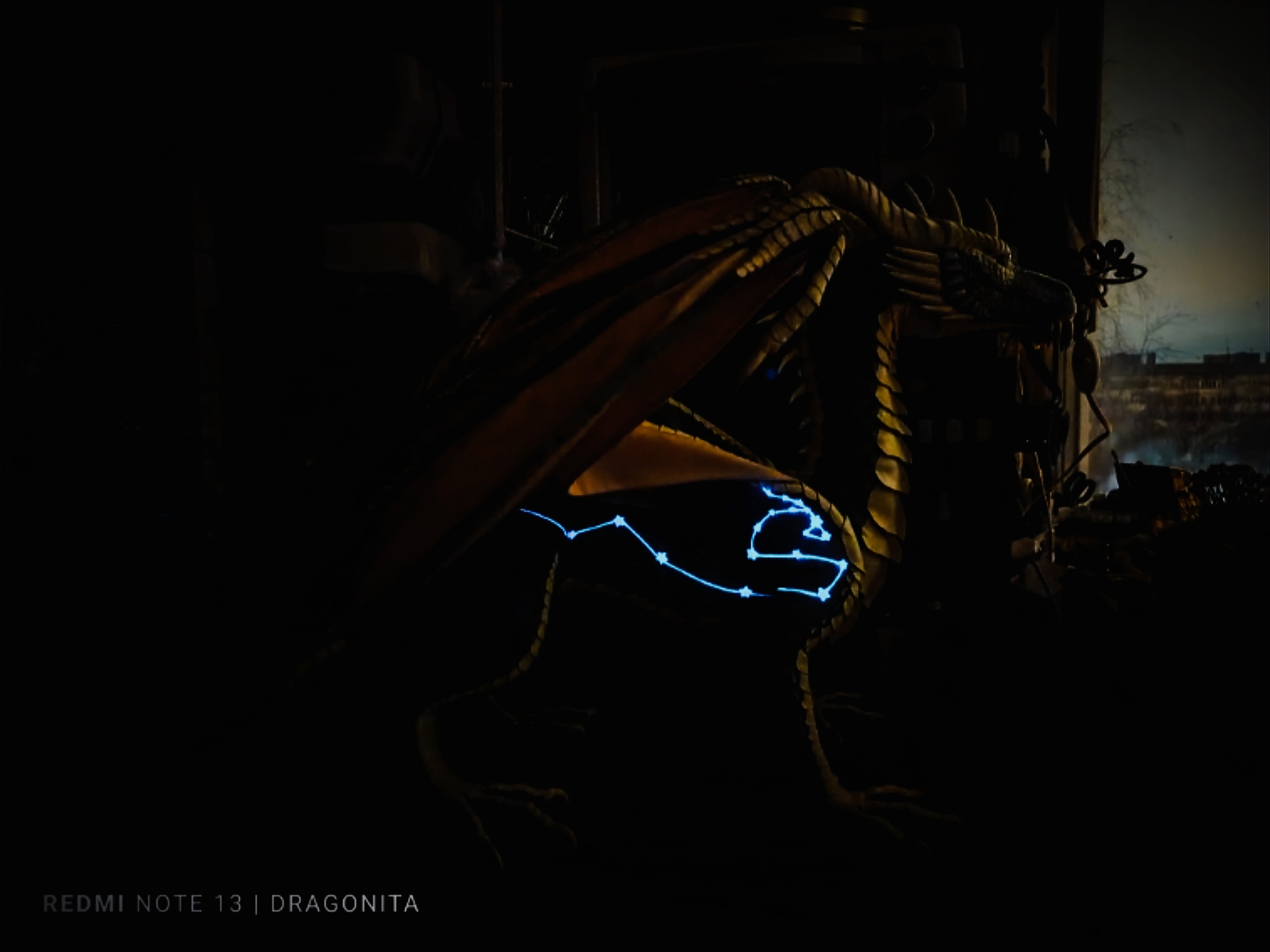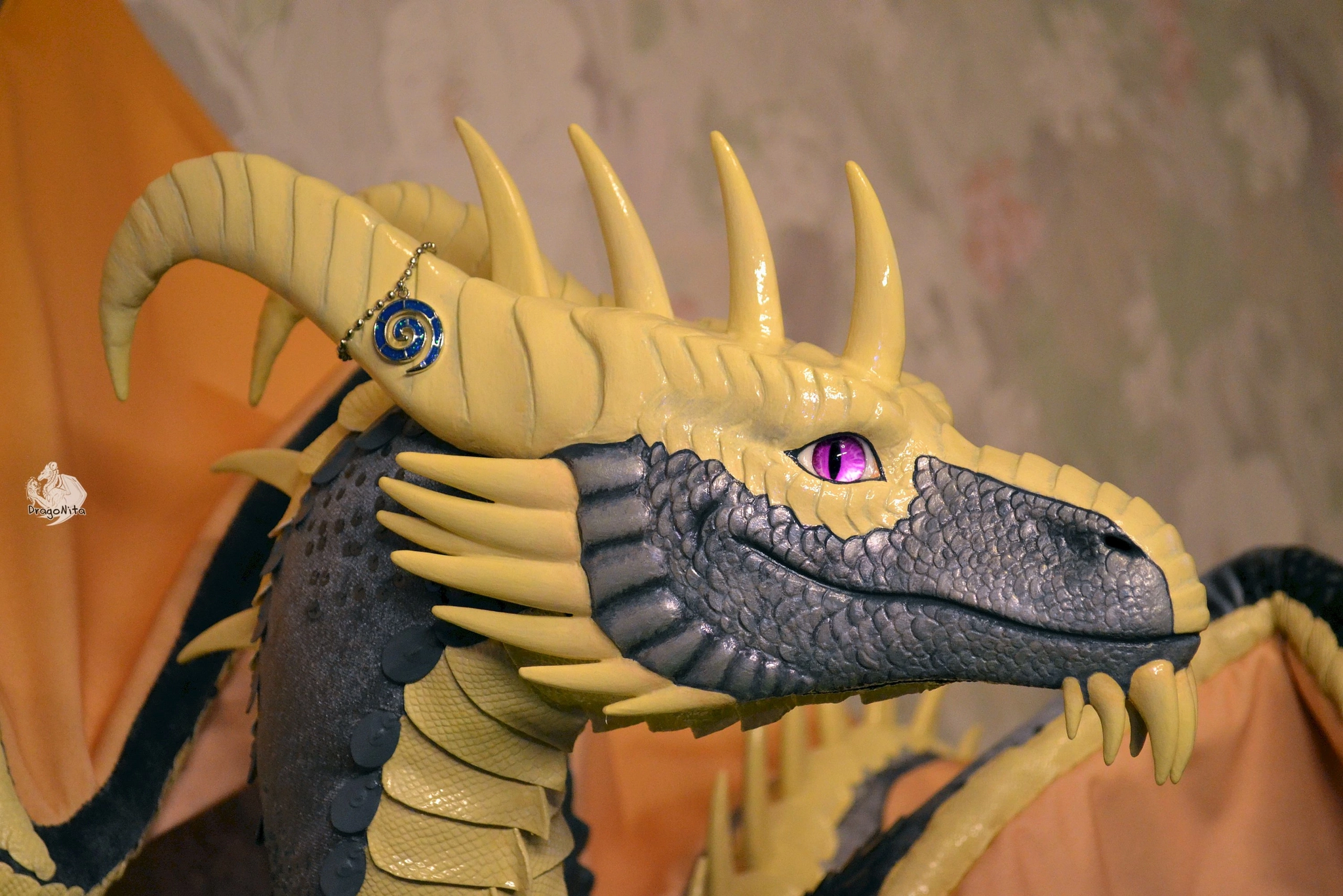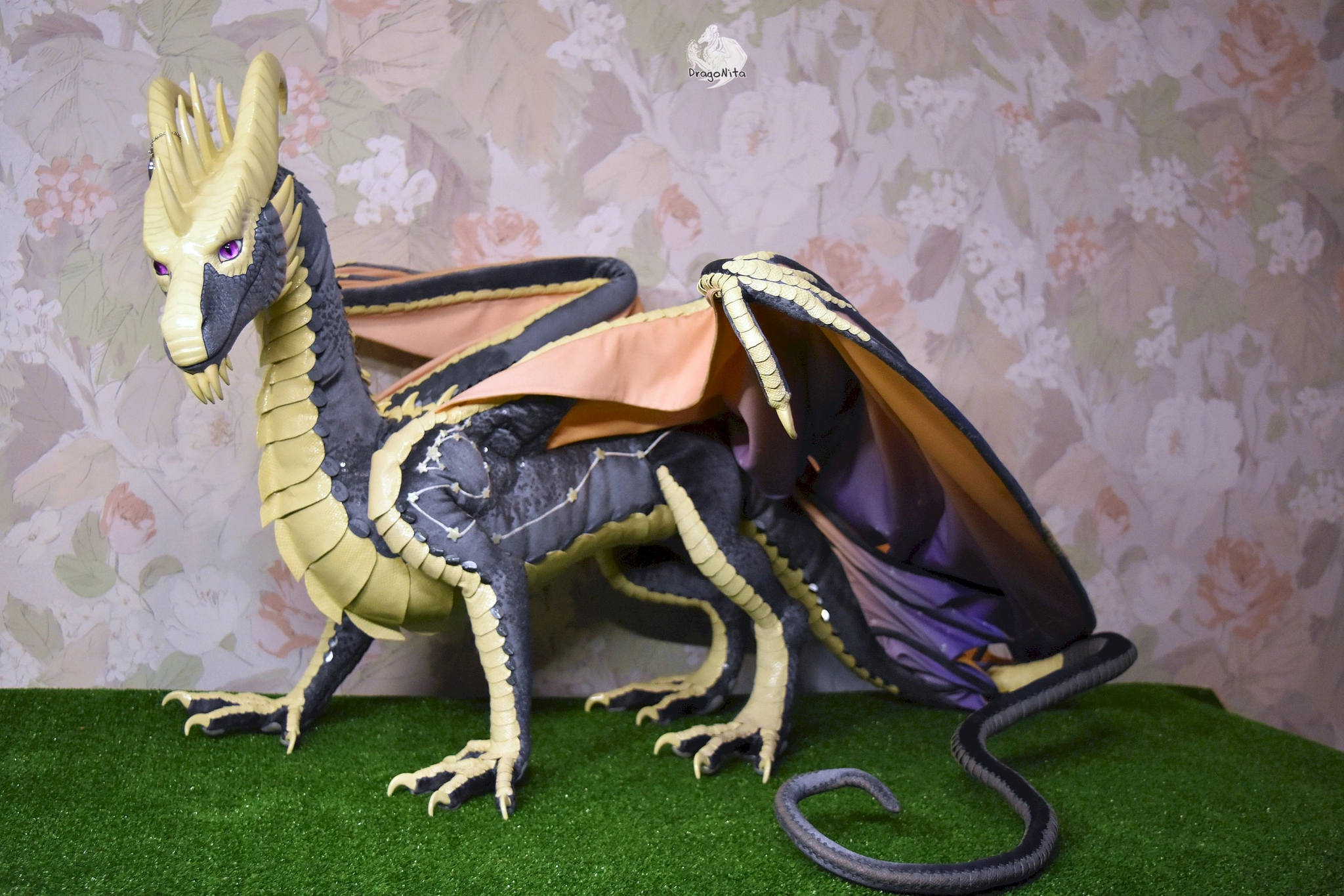 Выполнен в смешанной технике по рисунку заказчика. Полностью подвижный с очень прочным каркасом, весит 8 кг. Крылья имеют разный рисунок с изнанки и снаружи. Складываются и расправляются. Рисунок созвездия на боках светится в темноте.