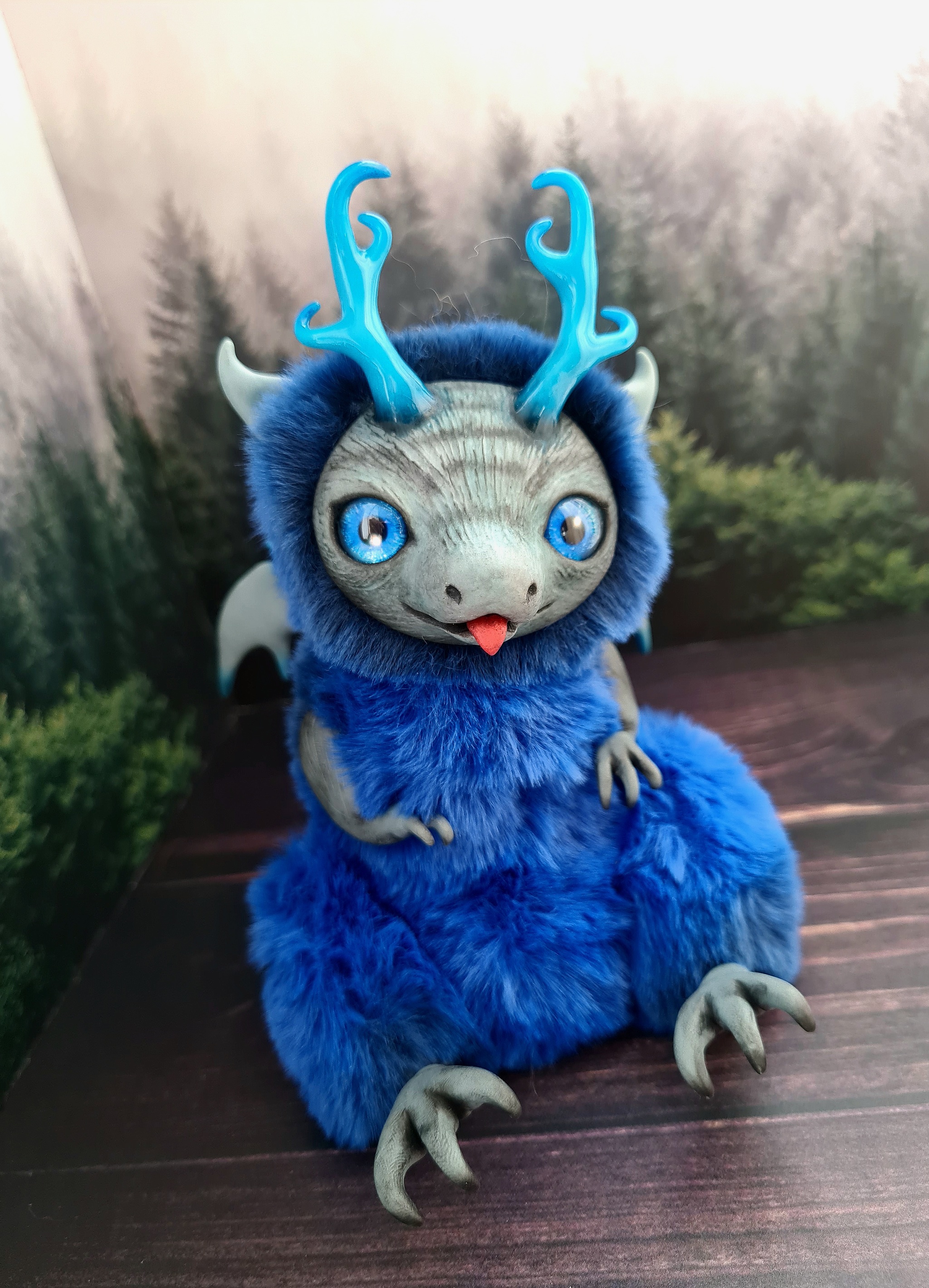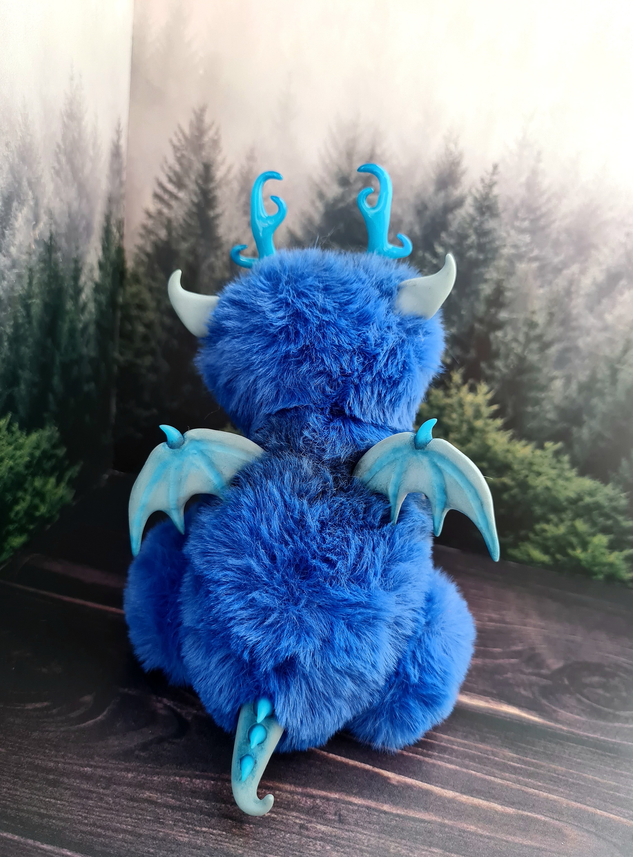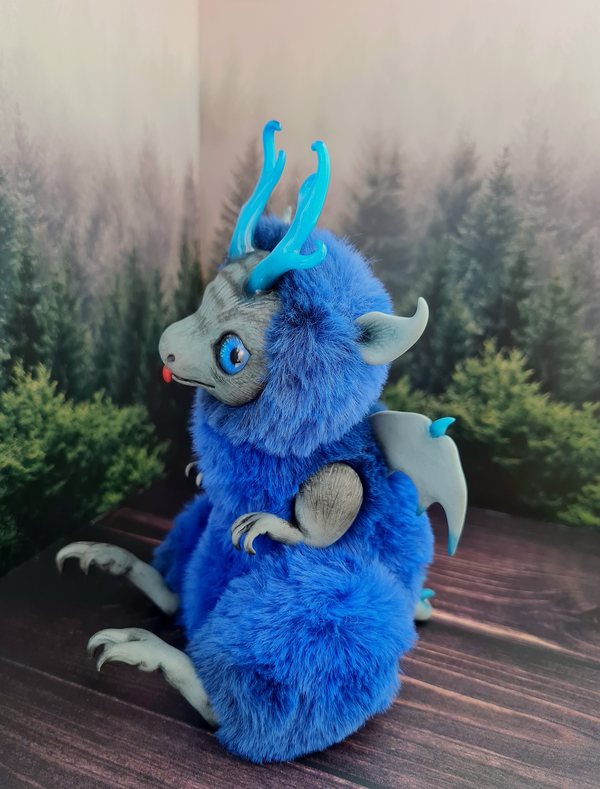 Выполнен из полимерной глины ( мордочка, лапки, ножки, ушки, рожки ,крылья ,хвост) ,мех искусственный.