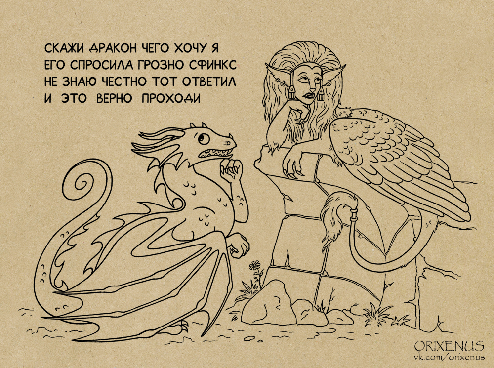 На картинку Льва (август) в драконий календарь по античным мифам так и просился Немейский лев, но что-то про него ничего не придумалось. В итоге на замену вышла Сфинкс - в греческой мифологии сидела такая дамочка поблизости от Фив и задавала путникам хитрые загадки. Пересдачи тогда ещё не придумали, так что Сфинкс неправильно ответивших просто съедала.