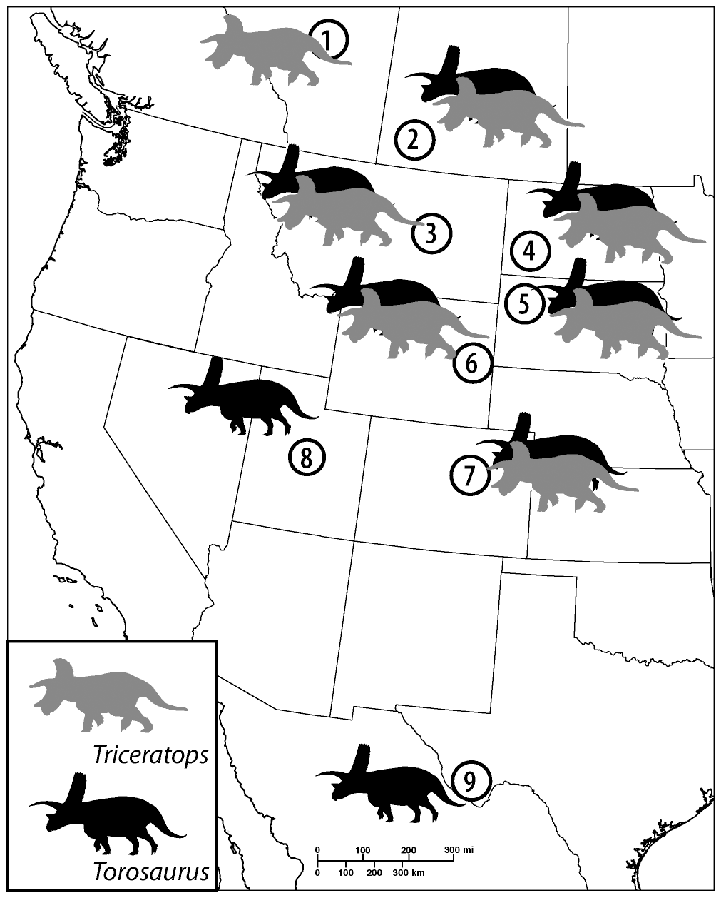 Ареал трицератопса (серый) и торозавра (чёрный)