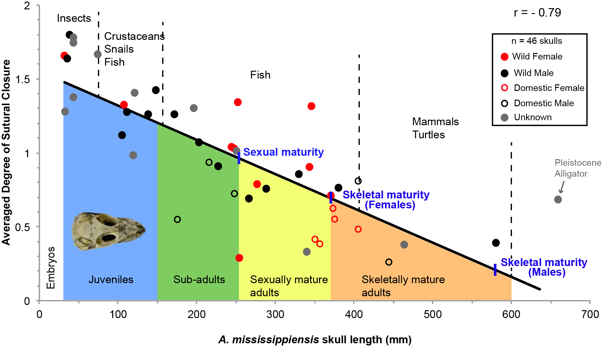 Линейная зависимость между взрослением аллигатора и шовным закрытием