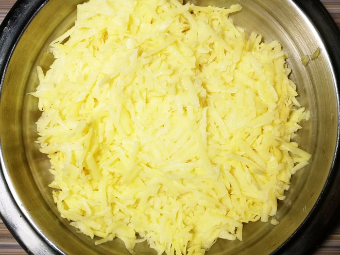 Картофель чистим, натираем на крупной терке. Натертый картофель отжимаем руками, убираем излишки сока: