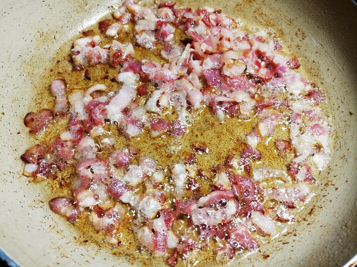 Мелко режем бекон, обжариваем: