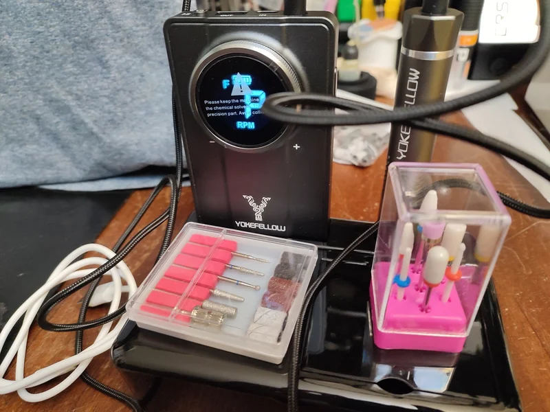 Профессиональная электрическая дрель для обработки ногтей. Скорость вращения двигателя достигает 40 000 оборотов в минуту. Поставляется в удобном ящичке с множеством насадок и пилок. Стоит набор для маникюра и педикюра 8 830 рублей. Ссылка на него