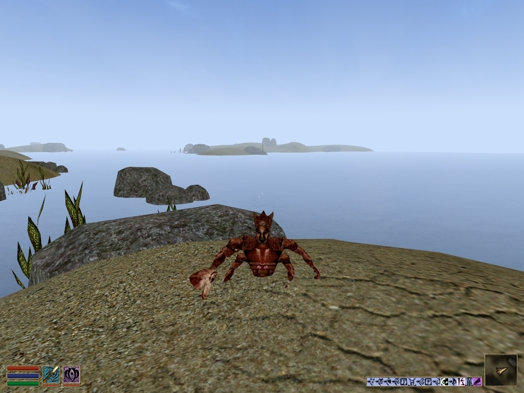 Первый раз вижу его здесь на суше. Возможно, это уже наземная форма, претерпевшая Карвиназим (Karvinasim). Однако источники утверждают, что в Морровинде они в данном виде не встречаются. Я в полном недоумении.