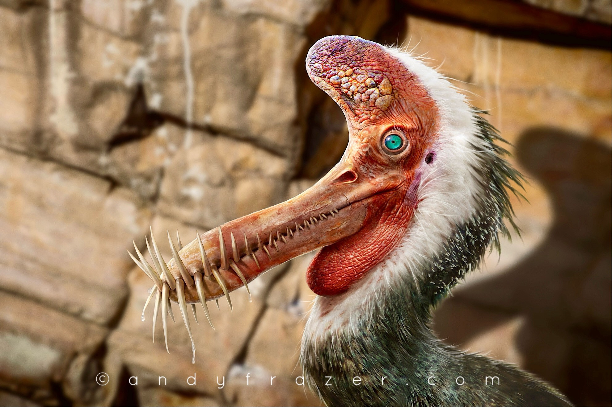 Цифровой портрет гуидрако — вымершей летающей рептилии с длинной мордой, на кончике которой торчат нелепо длинные изогнутые зубы. Голову украшает изогнутый гребень. Он изображён в сочетании ярко-розовых и оранжевых тонов, с чёрно-белыми нитями на шее и теле.